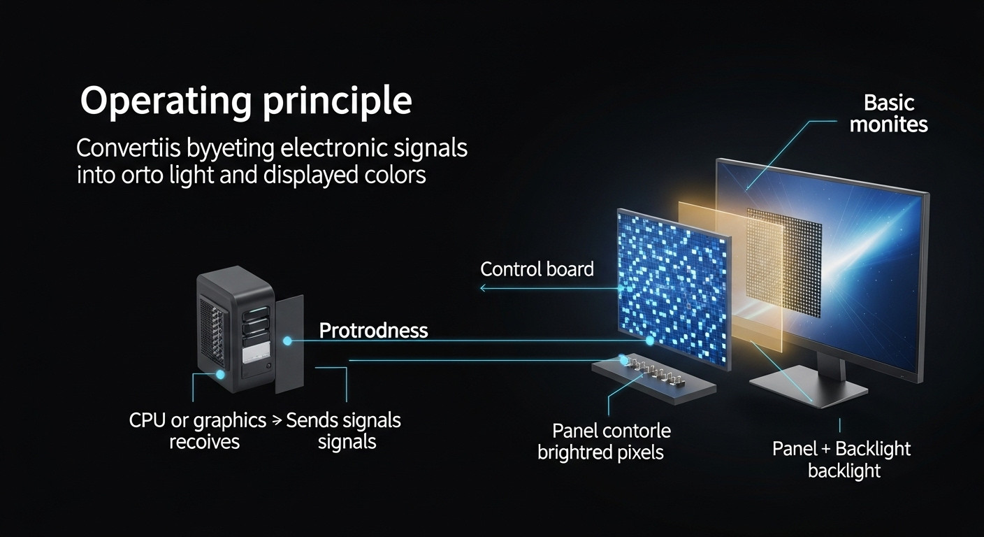 Màn hình máy tính hoạt động theo nguyên lý chuyển đổi tín hiệu điện tử thành ánh sáng và màu sắc hiển thị.